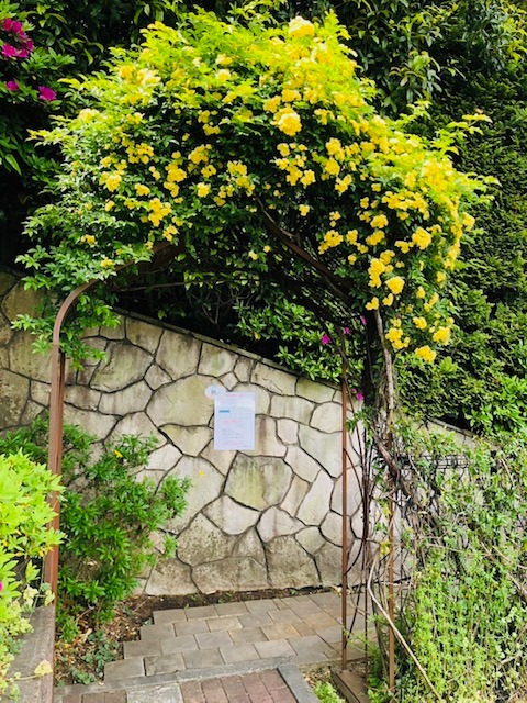 写真2枚目は園内の奥にございます「さいかいのひ」の1基に向かう途中のガーデンアーチのバラです。