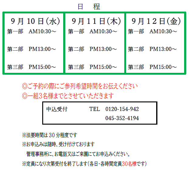 彼岸法要日程のお知らせ 2025-07-05 01:48:44 UTC 秋の彼岸法要を行いまうので、お知らせいたします。今回より一般墓の皆様にもご案内をしております。ご参列の方は、下記の注意事項をお読みいただきご予約をお願いいたします。◎ご予約の際にご参列ご希望時間をお伝えください。◎一組3名様までとさせていただきます。◎当日はお参りの方もいらっしゃいます、ご来園の際は『公共交通機関』をご利用のうえお越し下さい。申込受付 横浜セントヒル霊園管理事務所 TEL:0120-154-942 横浜セントヒル霊園 彼岸法要のお知らせ